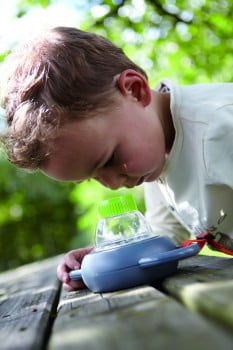 Odlična oprema za mlade raziskovalce. V tej posodi lahko pod močnim povečevalnim steklom opazujejo hrošče, pajke, liste in druge stvari,